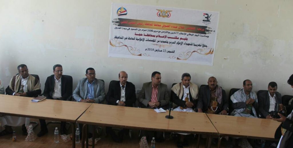 اقام مكتب الإعلام بمحافظة حجة اليوم حفلا تكريميا لشهداء الإعلام الحربي والمؤسسات والقنوات الإعلامية العاملة في المحافظة بمناسبة اليوم الوطني للإعلام الوطني ومرور ثلاث سنوات من الصمود في وجه العدوان.