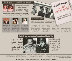كما أوضحت دائرة التوجيه المعنوي أن السعودية تولت الإشراف المباشر والمشاركة الفعلية في عملية إغتيال الرئيس إبراهيم الحمدي وكذلك إغتيال شقيقه قائد قوات العمالقة المقدم عبدالله الحمدي.. مؤكدة أن أبرز الضالعين من القيادات السعودية في جريمة اغتيال الحمدي هو علي بن مسلم مسؤول الملف اليمني في الديوان الملكي بدرجة مستشار.. كما أن الدور الأبرز في اغتيال الرئيس الحمدي كان للملحق العسكري السعودي بصنعاء صالح الهديان برتبة عقيد.
