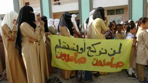 نظمت معلمات وطالبات مجمع السعيد التربوي بمديرية الميناء محافظة الحديده اليوم وقفه احتجاجيه تنديدآ بجرائم العدوان السعودي الأمريكي والحصار المفروض على الشعب اليمني..