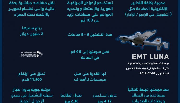 مواصفات الطائرة التجسسية الألمانية من طراز EMT Luna التي تم إسقاطها في أجواء منطقة الصوح قبالة #نجران On فبراير 12, 2019 Share ✈️ مواصفات الطائرة التجسسية الألمانية من طراز EMT Luna التي تم إسقاطها في أجواء منطقة الصوح قبالة #نجران 12-02-2019 #المرکز_الإعلامي_حجه Share FacebookTwitterGoogle+ReddItWhatsAppPinterestالبريد الإلكتروني
