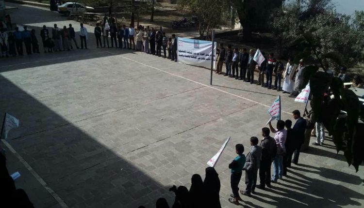 وقفة احتجاجية بالمعهد العالي لتدريب وتأهيل المعلمين بمحافظة حجه تنديدا واستنكارآ باستمرار العدوان ورفضا للتطبيع.