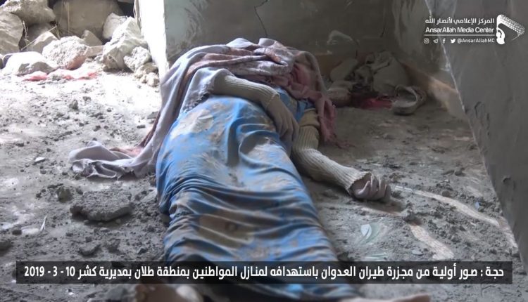 ?? More than 20 people were killed including 12 women & children after US-Saudi Coalition warplanes bombed civilian houses in #Kushar area in #Hajjah province 10-03-2019