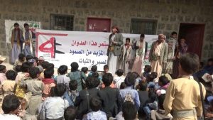 تحت عنوان أربعة اعوام من الصمود في وجه الغزاة وادواتهم، واستشعارا للمسؤلية الملقاة على عاتق جميع الأوفياء، وتواصلا للأنشطة والفعاليات بالمديرية ،تخللت الوقفة العديد من المشاركات والقصائد الشعرية المعبرة عن المناسبة كما تحدث المشاركون خلال الوقفة عن صمود الشعب اليمني وثباته في مواجهة العدوان الغاشم والانجازات العسكرية لقواتنا المسلحة والجيش واللجان الشعبية واكد المشاركون استشعارهم للمسؤليه وافشال كل المؤامرات حضر الوقفة عدد من الشخصيات الاجتماعية والثقافية،،