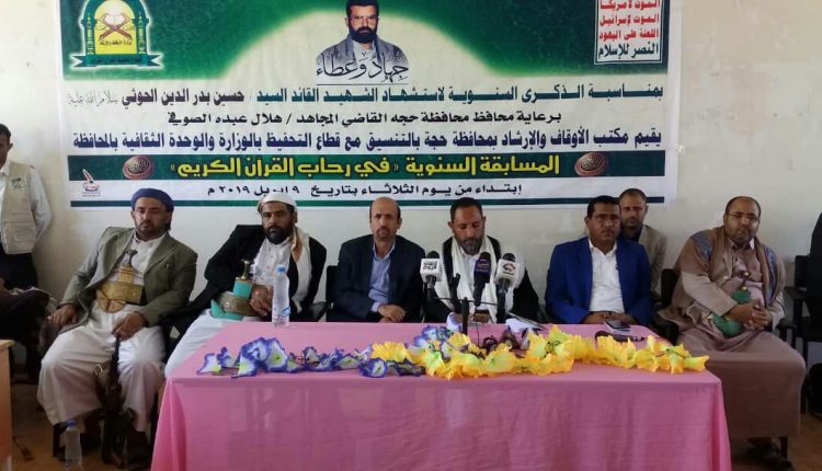 اقام مكتب الاوقاف والارشاد بمحافظة حجة برعاية محافظ المحافظة القاضي هلال عبدة الصوفي وبالتنسيق مع قطاع التحفيظ بالوزارة والوحدة الثقافية بالمحافظة المسابقة السنوية في رحاب القران الكريم وذلك احياءً للذكرى السنوية للشهيد القائد السيد حسين بدر الدين الحوثي سلام الله عليه
