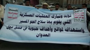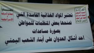 وعبر المشاركون في الوقفة عن رفضهم للمواد الغذائية الفاسدة التي تمنحها بعض المنظمات للمواطنين ، والذي اثبتت النتائج الميدانية لفرق التفتيش أن مساعدات برنامج الأغذية العالمي فاسدة وغير صالحة للاستخدام الأدمي.