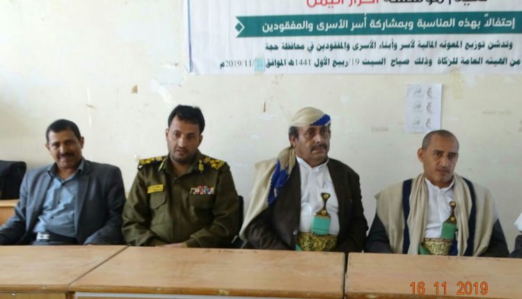دشنت مؤسسة احرار اليمن اليوم توزيع المعونة المالية لأسر وابناء الاسرى والمفقودين من ابطال الجيش واللجان الشعبية بمحافظة حجة والمقدمة من الهيئة العامة للزكاة وذلك ابتهاجا وحتفالا بذكرى المولد النبوي الشريف على صاحبة افضل الصلاة واتم التسليم