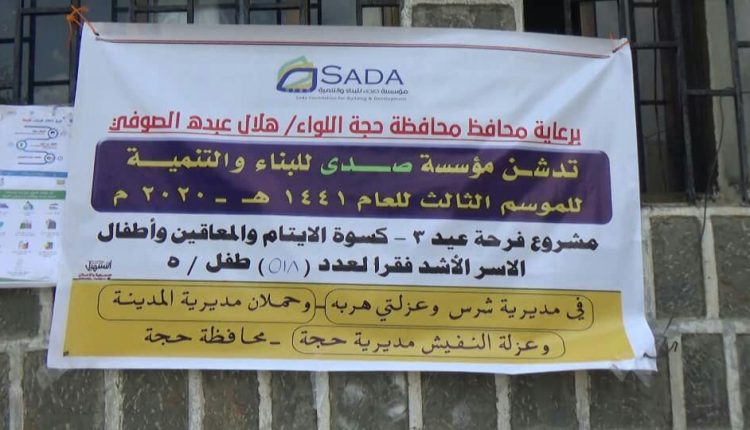 دشنت مؤسسة صدى للبناء والتنمية توزيع كسوة العيد بمشروع فرحة عيد – الموسم الثالث على التوالي والذي يستهدف الايتام والمعاقين والاشد فقرا بمديريات شرس وعزلتي حملان وهربه مديرية المدينه وعزلة النفيش ريف حجه لعدد 530 طفل وطفلة .
