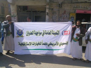 ومرتزقتهم وفي الوقفه الاحتجاجيه التي حضرها قيادات قبليه ومحليه رفع المتحجون لافتات وشعارات معبره عن استنكارهم للجرائم البشعه التي يرتكبها طيران العدوان السعودي الامريكي بحق المدنيين من النساء والاطفال وتدمير البني التحتيه واستنكر المتحجون في بيان لهم الصمت الدولي تجاه هذه الجرائم مطالبين للمنظمات الدوليه الانسانيه والحقوقيه القيام بواجبها الانساني والاخلاقي تجاه معاناه الشعب اليمني التي يتعرض لجرائم اباده جماعيه وتدهور للوضع الانساني بشكل مخيف بسبب الحصار الاقتصادي المفروض علي البلد جوا وبرا وبحرا من قبل دول العدوان وحلفائهم واكد المحتجون علي دعمهم وتاييدهم للخيارات الاستيراتيجيه للجيش واللجان
