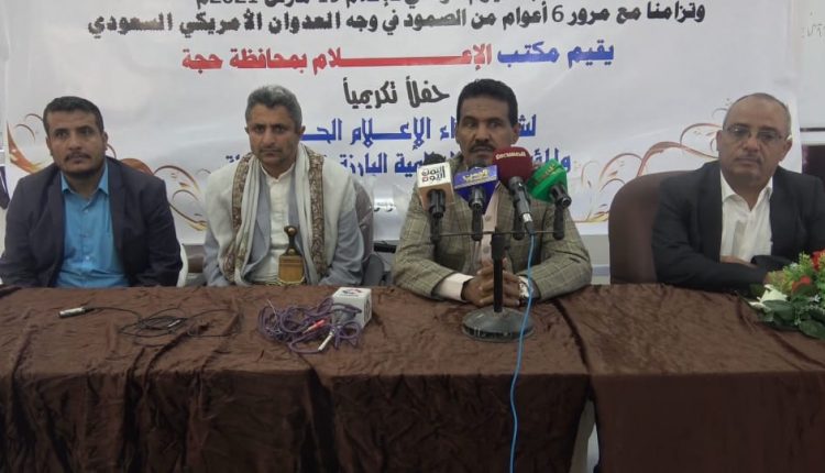 وفي التكريم أشاد أمين عام المجلس المحلي بالمحافظة إسماعيل المهيم بحضور رئيس جامعة حجة الدكتور محمد الخالد ووكيل قطاع الإعلام عادل شلي، بجهود الإعلاميين في كشف الأحداث وايضاح الصورة الحقيقية أمام المواطنين وفضح زيف وكذب وادعاءات العدوان.