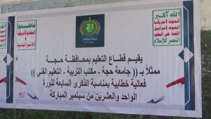 أقيمت اليوم بمحافظة حجة فعالية خطابية بالعيد السابع لثورة 21 سبتمبر المجيدة نظمتها جامعة حجة ومكتب التربية والتعليم، والتعليم الفني.