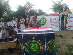 وفي المسيرة التي حضرها عبدالكريم الخموسي مشرف مربع تهامة ومدير عام كعيدنه أحمد محمد جناح ومدير عام مديرية قفل شمر القاضي ابراهيم ابو خرفشه أكد مدير عام كعيدنه أن الاحتفال بهذه المناسبة يؤكد واحدية الثورة اليمنية والوفاء لدماء الشهداء، والمضي على النهج الذي اختطوه بدمائهم في الدفاع عن الوطن وأمنه وحريته واستقلاله.