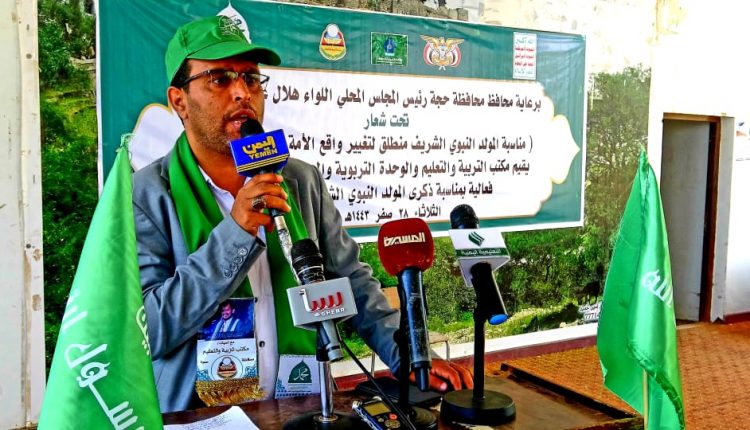 نظم مكتب التربية والتعليم والوحدة التربوية والمعهد العالي لتأهيل المعلمين بمحافظة حجة اليوم فعالية ثقافية في ذكرى المولد النبوي الشريف .