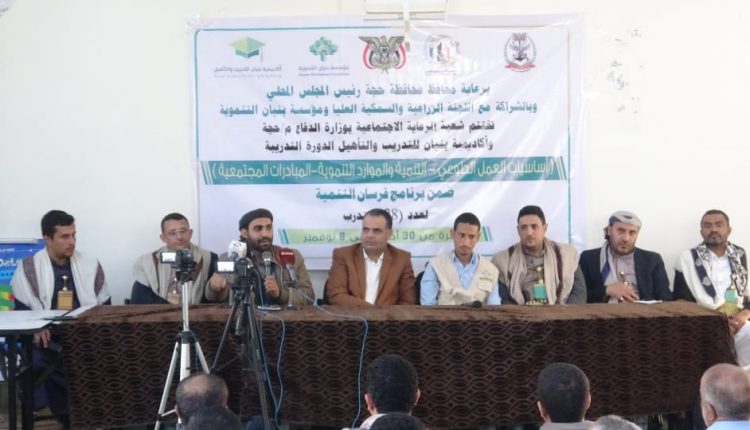 اختتمت بمحافظة حجة دورة تدريبية ضمن برنامج فرسان التنمية، نظمتها أكاديمية بنيان للتدريب والتأهيل بالشراكة مع المجلس المحلي بالمحافظة واللجنة الزراعية السمكية العليا وشعبة الرعاية الاجتماعية.