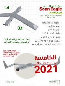 وقال ناطق القوات المسلحة العميد يحيى سريع في بيان مقتضب: تمكنت دفاعاتنا الجوية – بفضل الله – من إسقاط طائرة تجسسية مسلحة نوع (سكان إيغل Scan Eagle) أمريكية الصنع أثناء قيامها بأعمال عدائية صباح يومنا هذا في أجواء منطقة الجوبة بمحافظة مأرب.