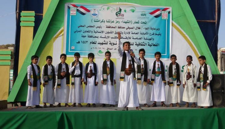 نظم فرع المجلس الأعلى لإدارة وتنسيق الشئون الإنسانية بمحافظة حجة، ومكتبي الهيئة العامة للأوقاف والارشاد وشئون الحج والعمرة ، اليوم أمسية ثقافية بالذكرى السنوية للشهيد.