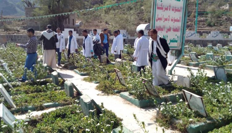 وقرأ مدير مكتب الصحة العامة والسكان بالمحافظة الدكتور أحمد الكحلاني وكوادر القطاع الصحي خلال الزيارة الفاتحة إلى أرواح الشهداء .. مؤكدين السير على دربهم حتى تحقيق النصر.