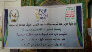 نظم أمن محافظة حجة اليوم، ندوة ثقافية بذكرى جمعة رجب بعنوان “الإيمان يمان”.