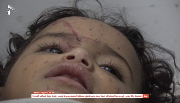 ?صور_ استشهاد إمرأة وجرح عشرة اشخاص آخرين في جريمة استهداف منزل مواطن بعبس حجة On فبراير 21, 2022 Share حجة نيوز شهيدة و10 جرحى في جريمة استهداف أسرة احمد محمد تمري بمنطقة السقف مديرية عبس- محافظة حجة بغارة جوية لقوى العدوان 20-07-1443 | 21-02-2022 Share FacebookTwitterGoogle+ReddItWhatsAppPinterestالبريد الإلكتروني