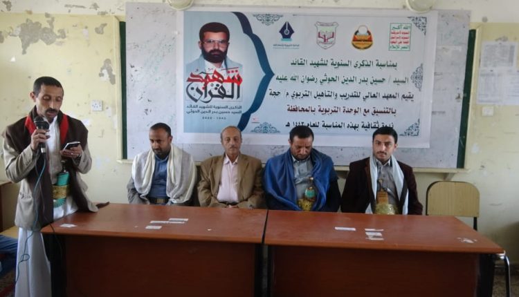 نظم المعهد العالي للتأهيل والتدريب التربوي بمحافظة حجة بالتنسيق مع الوحدة التربوية ندوة ثقافية بالذكرى السنوية للشهيد القائد حسين بدر الدين الحوثي.