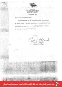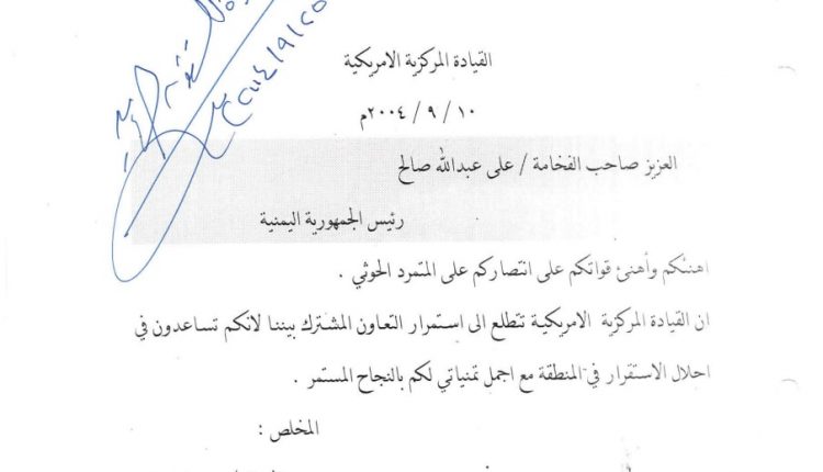 ? الوثيقة الرابعة: شكر أمريكي لعلي عبدالله صالح على قتل الشهيد القائد السيد حسين بدرالدين الحوثي On فبراير 25, 2022 Share حجة نيوز Share FacebookTwitterGoogle+ReddItWhatsAppPinterestالبريد الإلكتروني