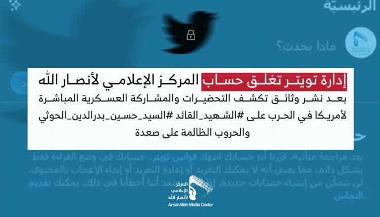 إدارة تويتر تغلق حساب المركز الإعلامي لأنصار الله بعد نشر وثائق تكشف التحضيرات والمشاركة العسكرية المباشرة لأمريكا في الحرب على الشهيد القائد السيد حسين بدرالدين الحوثي والحروب الظالمة على صعدة On فبراير 25, 2022 Share حجة نيوز Share FacebookTwitterGoogle+ReddItWhatsAppPinterestالبريد الإلكتروني