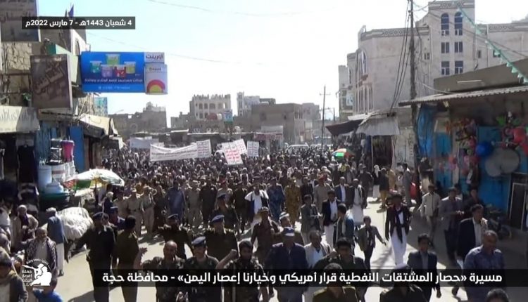 شهدت مدينة حجة اليوم مسيرة حاشدة للتنديد باستمرار احتجاز سفن المشتقات النفطية تحت شعار “حصار المشتقات النفطية قرار أمريكي وخيارنا إعصار اليمن”