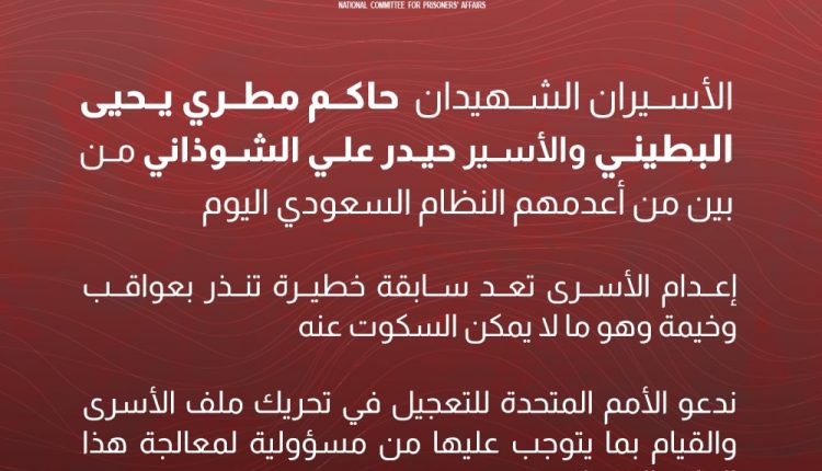 اللجنة الوطنية لشؤون الأسرى: علمنا أن من بين العشرات الذين أعدمهم النظام السعودي أسيران سيق بهما لساحة الإعدام ظلما وعدوانا
