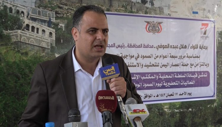وفي الفعالية بحضور وكيلي المحافظة الدكتور طه الحمزي وعادل شلي وعدد من مديري المكاتب التنفيذية والشخصيات الاجتماعية أشار وكيل المحافظة محمد القاضي إلى ان السبع السنوات الماضية دلت على عظمة الشعب اليمني وعدالة قضيته ومشروعية القضية التي يقاتل من أجلها وتجرع خلالها العدو الهزائم والخسران ومواقف الذل والهوان.
