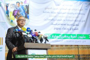 ولفت إلى المشاريع التي تنفذها هيئة الزكاة بالشراكة مع رجال المال والأعمال والتي انطلقت بمشروع مليون رغيف يوميا للفقراء والذي يليه عدة مشاريع في إطار جبهة تكافلية لتخفيف المعاناة عن أبناء الشعب في جميع المحافظات.