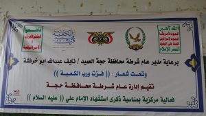 برعاية مدير عام شرطة محافظة حجة، العميد نايف عبدالله أبوخرفشة، أقامت شرطة المحافظة فعالية ثقافية وخطابية بمناسبة ذكرى استشهاد الإمام علي علية السلام.