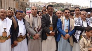 تخللت المسيرة التي شارك فيها مدراء المكاتب التنفيذية والمديريات وأعضاء المجالس المحلية والتربويون والقطاع الصحي والأكاديمي والعلماء وقيادات أمنية وعسكرية، قصيدة للشاعر علي النعمي.