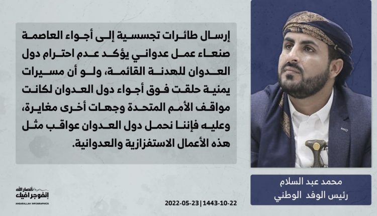 رئيس الوفد الوطني المفاوض محمد عبدالسلام: إرسال طائرات تجسسية إلى أجواء العاصمة صنعاء عمل عدواني يؤكد عدم احترام دول العدوان للهدنة القائمة On مايو 23, 2022 Share حجة نيوز Share FacebookTwitterGoogle+ReddItWhatsAppPinterestالبريد الإلكتروني