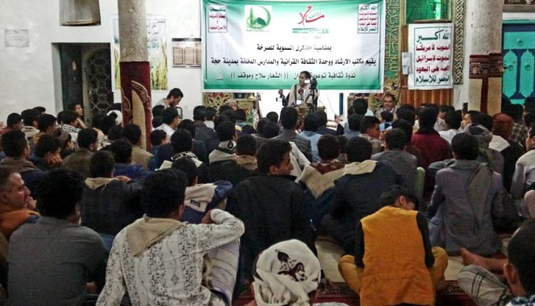 نظم مكتب الإرشاد بمحافظة حجة والوحدة الثقافية وإدارة المراكز الصيفية المغلقة اليوم ندوة بالذكرى السنوية للصرخة في وجه المستكبرين تحت عنوان ” الشعار سلاح وموقف”.