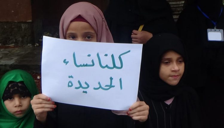 نظمت الهيئة النسائية الثقافية بمدينة حجة وقفة احتجاجية تنديدا بجريمة إغتصاب 6 نساء في مديرية حيس بمحافظة الحديدة والاساءة للرسول الأعظم من قبل متحدث الحزب الحاكم الهندي.