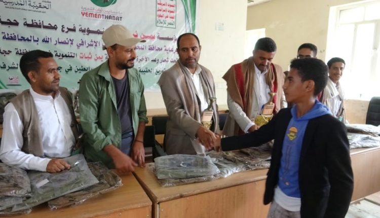 دشن فرع مؤسسة يمن ثبات التنموية في محافظة حجة اليوم مشروع توزيع الحقيبة المدرسية لأبناء المرابطين في الجبهات.