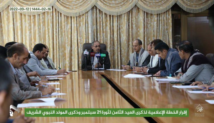 أقر لقاء موسع اليوم بصنعاء برئاسة وزير الإعلام ضيف الله الشامي، الخطة الإعلامية لتغطية الاحتفالات بالعيد الثامن لثورة 21 سبتمبر وذكرى المولد النبوي الشريف 1444هـ.
