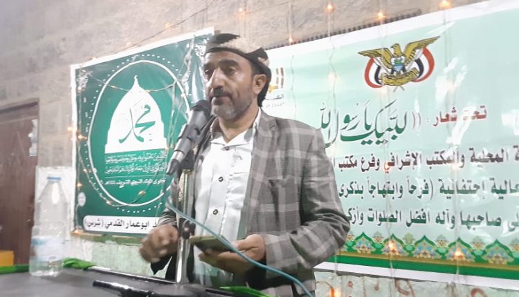 وفي الأمسية بحضور رئيس وأعضاء المجلس المحلي ومديرو المكتب التنفيذي والشخصيات الاجتماعية والعلماء أشارت الكلمات إلى عظمة المناسبة الدينية الجليلة في وجدان الشعب اليمني.