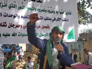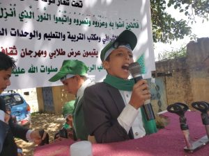 ورفع الطلاب في المسيرة التي شارك فيها نائب مدير مكتب التربية والتعليم بالمحافظة محسن جهلان ورئيس شعبة التدريب عبد الغني شرف الدين الشعارات واللافتات والأعلام المعبرة عن مظاهر الاحتفاء والبهجة والحب والتعظيم للرسول الأكرم.