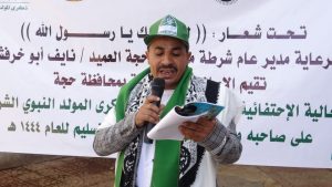 وفي الفعالية التي حضرها مدير شرطة مديرية المدينة المقدم محمد سلبة ونائب مدير منطقة ظهر أبو طير الأمنية الرائد طه شرف الدين ونائب مدير شرطة مديرية المدينة العقيد علي السقياء، اٌلقيت العديد من الكلمات أكدت على صدق الولاء والاقتداء والانتماء وحب المصطفى صلوات ربي وسلامه عليه وعلى آله.