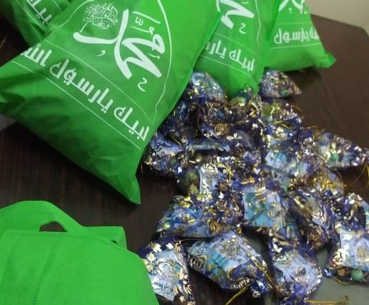 تحتوي الهدايا على ملابس بناتية واكسسوارات وحقائب وحلوى مقدمة من الجهات التي شاركت في بازار الرسول الأعظم السنوي الأول للمنتجات المحلية.