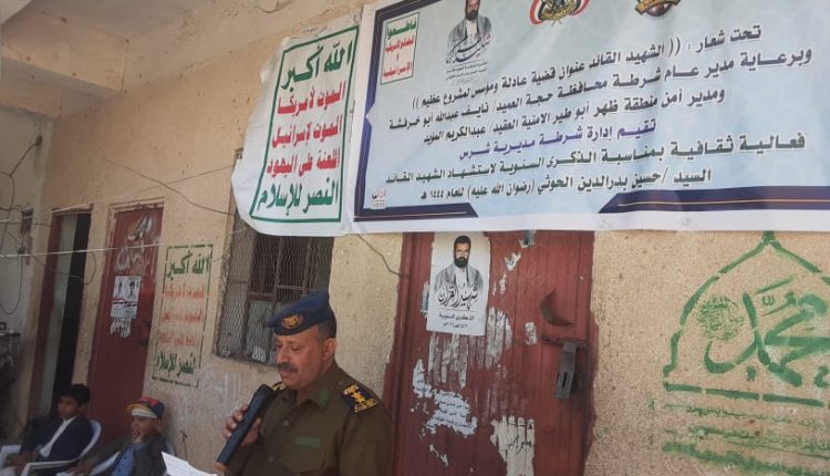 نظمت إدارتا أمن شرس والمغربة بمحافظة حجة، اليوم، فعاليتين ثقافيتين بالذكرى السنوية للشهيد القائد حسين بدر الدين الحوثي.