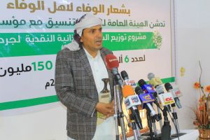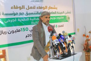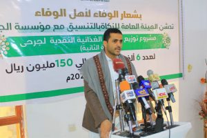 دشنت الهيئة العامة للزكاة اليوم بصنعاء ، بالتنسيق مع مؤسسة الجرحى ، مشروع توزيع السلال الغذائية النقدية لعدد 6 آلاف جريح “الفئة الثانية” بتكلفة إجمالية بلغت 150 مليون ريال تحت شعار ” الوفاء لأهل الوفاء”.