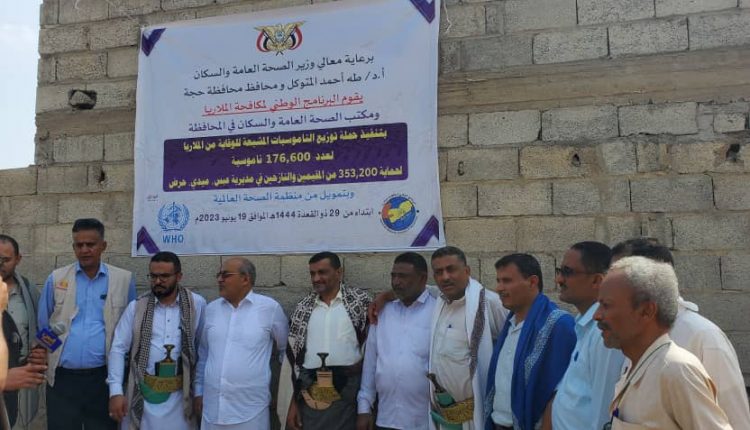 دشن وكيلا وزارة الصحة العامة والسكان لقطاع الرعاية الدكتور محمد المنصور ومحافظة حجة نبيل الجرب، في مديرية عبس بالمحافظة حملة توزيع الناموسيات المشبعة بالمبيد للوقاية من الملاريا بتمويل من منظمة الصحة العالمية بتكلفة 44 مليوناً و386 ألف ريال.