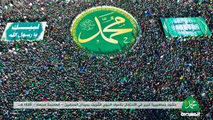 وتوسطت الحشود المليونية مساحة بيضاء كتب فيها اسم النبي محمد صلى الله عليه وآله وسلم باللون الأخضر، والتف الجميع حولها مرددين بأعلى أصواتهم “لبيك يا رسول الله”.