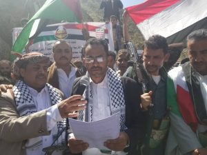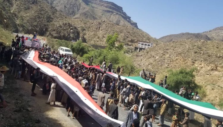 ورفع طلاب المدارس، العلمين الفلسطيني واليمني .. مرددين الشعارات المؤكدة الوقوف إلى جانب الشعب الفلسطيني ومقاومته الباسلة في مواجهة الكيان الصهيوني الغاصب.