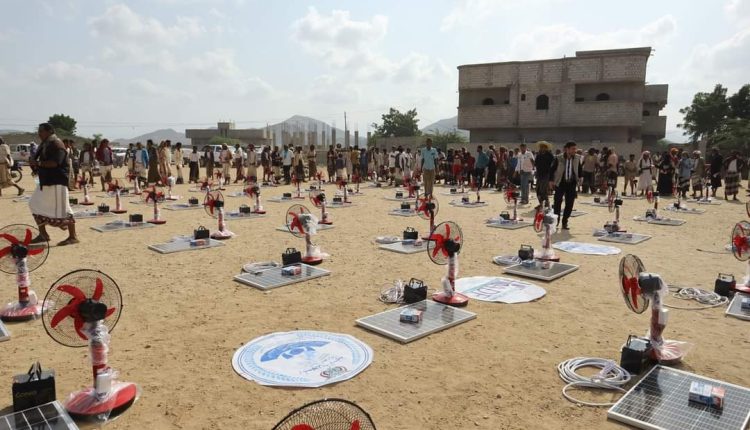 دشن مدير فرع المجلس الأعلى لإدارة وتنسيق الشؤون الإنسانية في حجة علان فضائل، توزيع مواد إيوائية ومراوح تعمل بالطاقة الشمسية ودورات مياه لمخيمات النازحين في مديرية عبس.