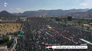 وأكدت الحشود أن خروج الشعب اليمني بهذا الشكل الكبير والواسع في العاصمة صنعاء والمحافظات، يعبر عن الوفاء لدماء شهداء معركة الفتح الموعود والجهاد المقدس إسنادا لطوفان الأقصى، ويعلن للعالم أجمع أن الشعب اليمني لا يتراجع عن موقفه الإيماني ولا يخنع للمستكبرين مهما كان حجم المواجهة والتضحيات.