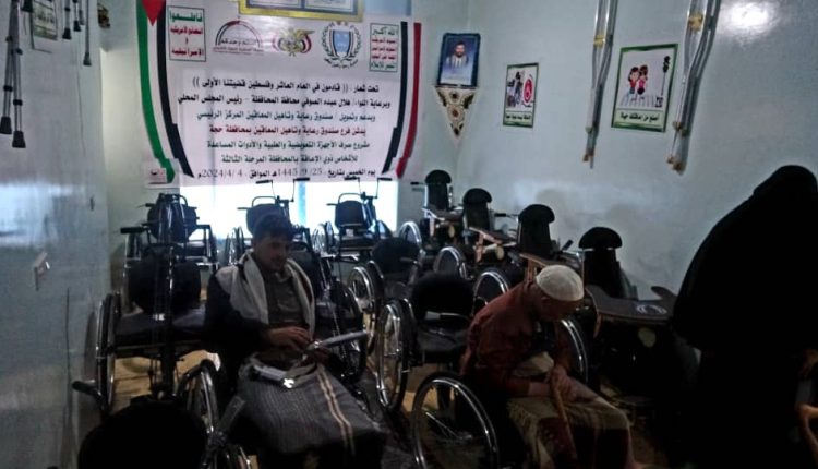 دشن فرع صندوق رعاية وتأهيل المعاقين في محافظة حجة اليوم المرحلة الثالثة من مشروع توزيع الاجهزة التعويضية والطبية والأدوات المساعدة للأشخاص ذوي الإعاقة تحت شعار ” قادمون في العام العاشر وفلسطين قضيتنا الأولى”.