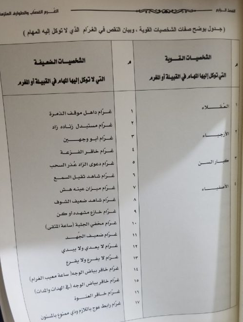 كما أبرزت الثوابت العرفية مواصفات الشخصيات الضعيفة التي لا تسند إليها المهام والتي تضمنت 17 بندا بينت صفات النقص فيهم وعلى النحو التالي: