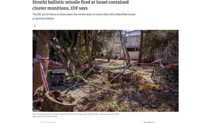وأشارت إلى أن التحقيق الذي أجراه “سلاح الجو” الإسرائيلي، الأحد، قد توصل إلى أن الصاروخ الباليستي الذي أطلقه “الحوثيون” ليل الجمعة كان يحتوي على قنابل عنقودية ، وهي المرة الأولى خلال الحرب التي يستخدمون فيها هذا النوع من الأسلحة. مضيفة أن هذا النوع من الصواريخ لديه احتمال أكبر للتسبب بأضرار، لأنه ينقسم إلى أجزاء عديدة يمكن أن تُحدث تأثيرات متعددة. “وقد أقرّ جيش الدفاع الإسرائيلي بفشله في إسقاط الصاروخ بسبب عطل بشري أو فني مجهول، وليس لاحتواء الصاروخ على ذخائر عنقودية” حسب مزاعم الصحيفة.